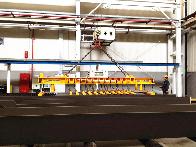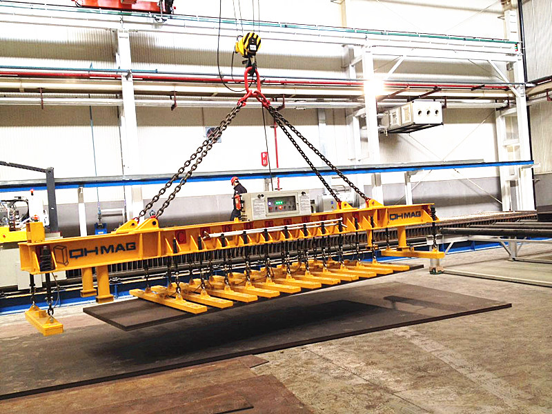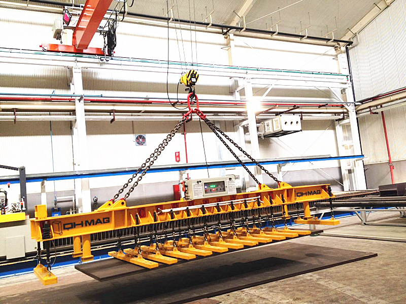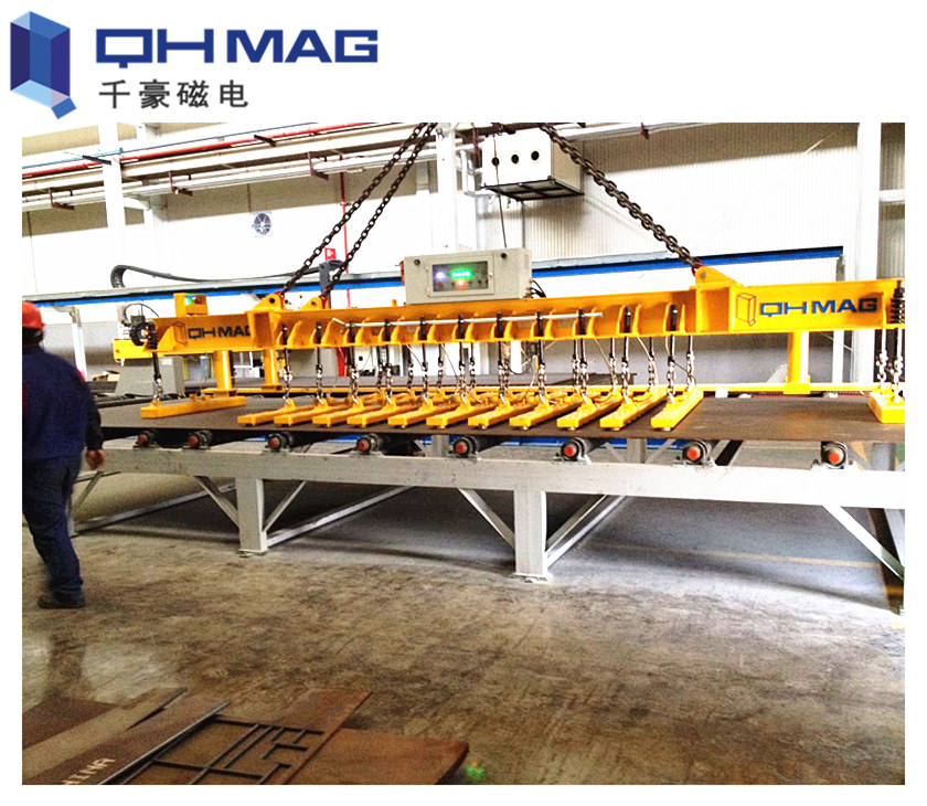 湖南千豪鋼板上下料切割線用電永磁吊具屬于鋼板吊具的一種:鋼板切割線(火焰切割、等離子切割、激光切割等)的上下料,通常要求上料時(shí)只吊運(yùn)一張整板,切割完后,所有切割工件一次性或盡量多的從切割臺(tái)上吊運(yùn)下來,針對(duì)這一要求,千豪磁電研發(fā)了矩陣式和密布式電永磁吊具系統(tǒng)。