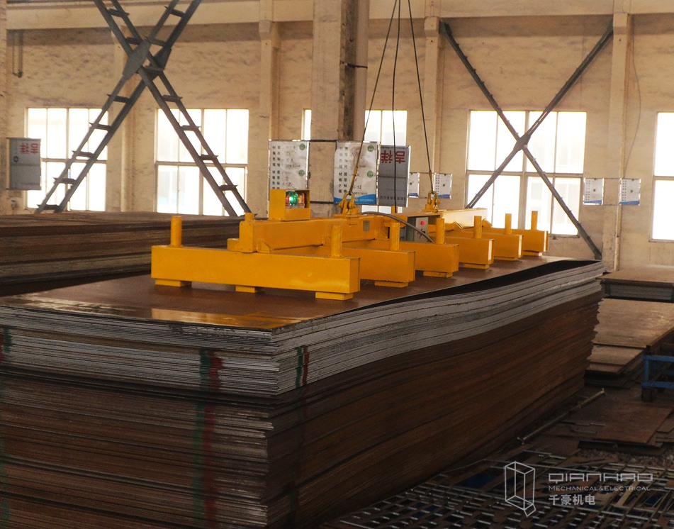千豪磁電薄板起重電永磁吊具對3mm鋼板的吸力可達12kg/cm²,吊運疊層鋼板時絕不會黏連第二張鋼板,聯(lián)吊時,合理的布局和懸掛方式可控制薄板的撓度變形。